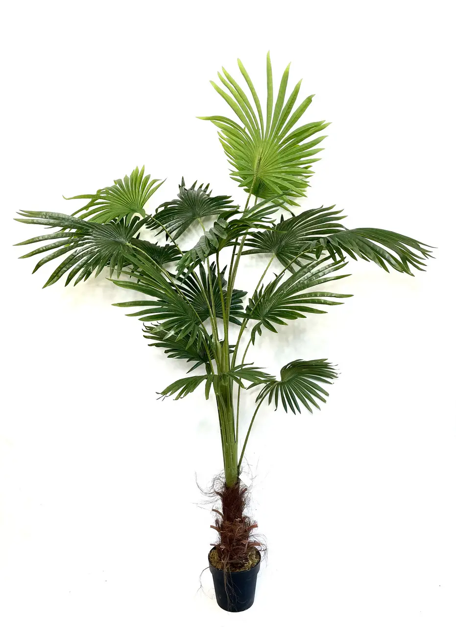 Штучна імітація пальми Лівістона (Livistona) вражає своєю неймовірною подібністю до природної пальми родом з далеких Молуккських островів та острова Ява. Завдяки майстерно відтвореним деталям, ця штучна рослина створює враження живої пальми. Величезне, жорстке соковите-зелене листя, округлої форми створює враження справжнього тропічного раю в будь-якому просторі. Розрізане на 2/3 довжини листя, як майстерно розроблене віяло, надає цій штучній пальмі Лівістона особливого шарму. Відома також під назвою “віялова пальма”, ця рослина стала символом розкоші, адже її величезне листя використовували як віяла для вельмож ще з давніх часів. Технічні данні: Висота рослини разом із горщиком: 180 см Розмах листя: 130 см Кількість стебел: 1 Розмір горщика: діаметр 20 см, висота 17 см Габарити в упаковці: 170*26*26 см, вага 8 кг