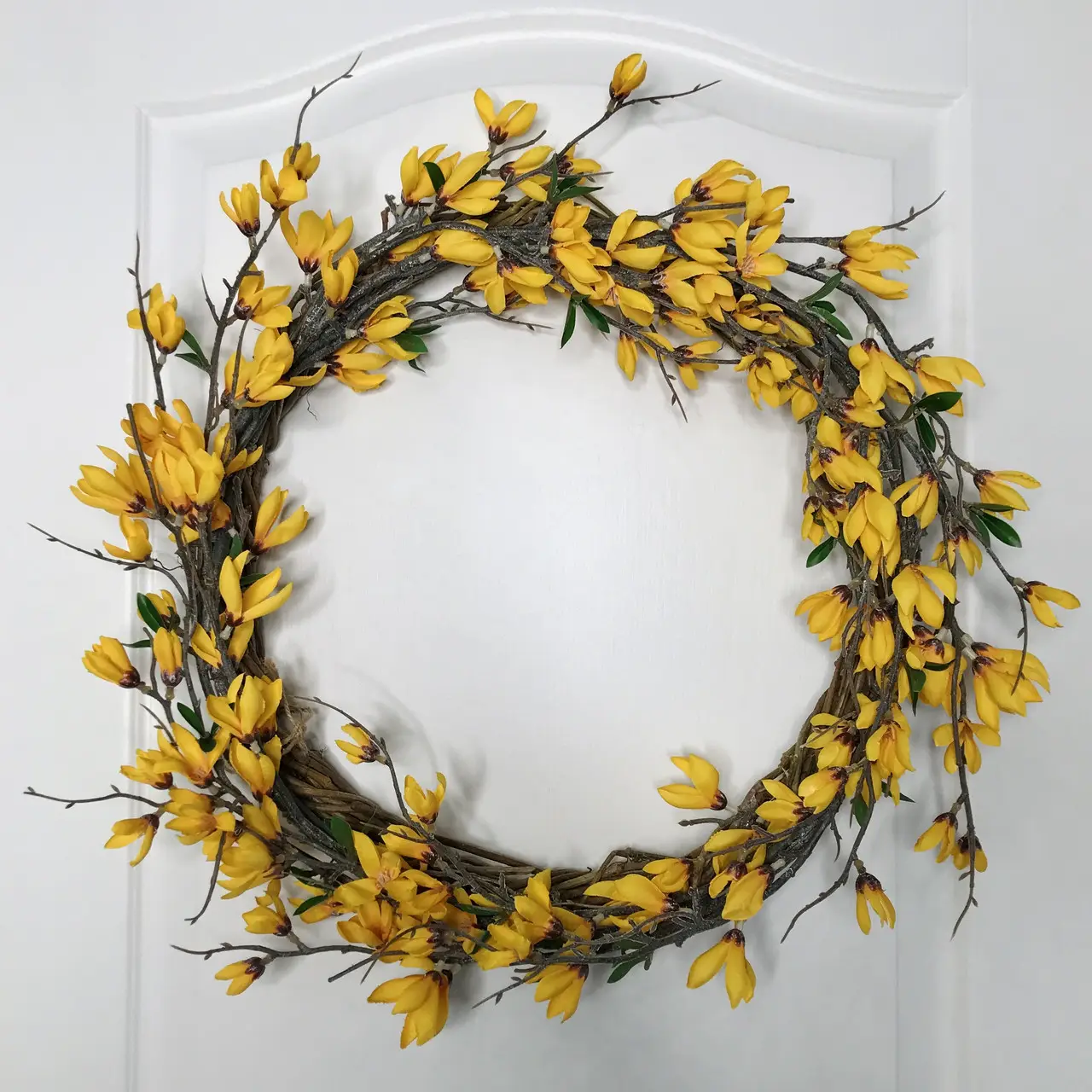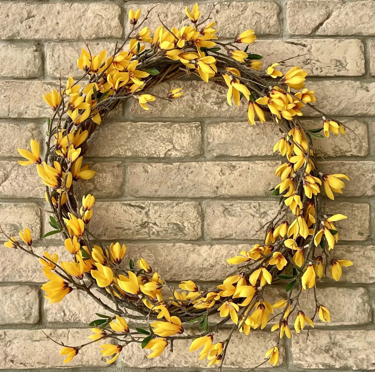 Весняний декоративний віночок із форзиції – це творіння сповнене яскравості та радісної енергії весняного дня. Витончені гілочки форзиції вкриті яскраво-жовтими квіточками, надають віночку виразний та енергетичний характер і дарують вашому простору частинку сонця та тепла. Використовуйте його для створення вражаючого акценту на ваших вхідних дверях, де яскраві квіти форзиції стануть справжнім символом приходу весни. Цей віночок виглядає чудово в будь-якому інтер’єрі, створюючи яскравий фокус в будь-якому приміщенні. Діаметр 50 см.